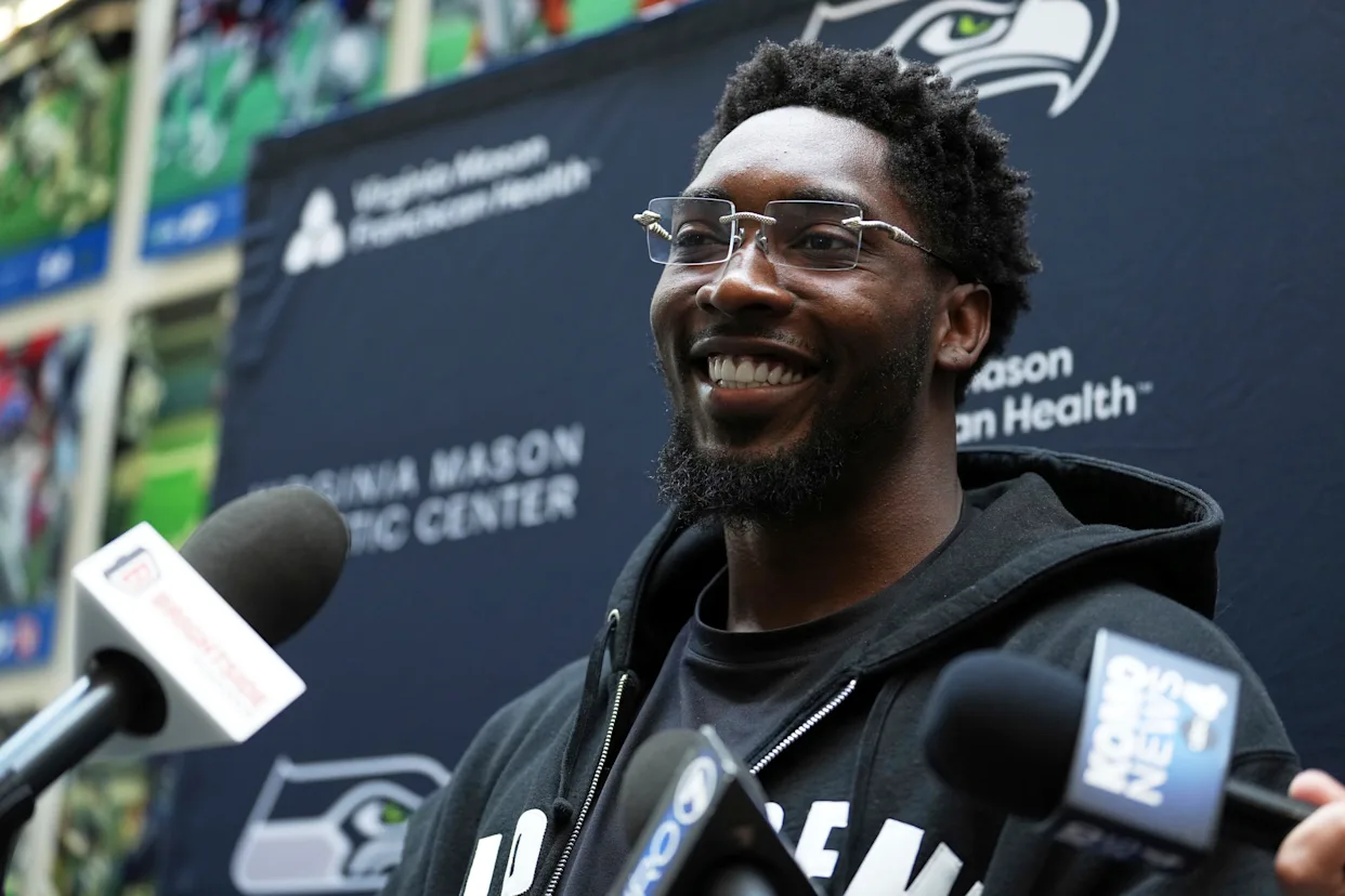 El ala defensiva de los Seahawks de Seattle, DeMarcus Lawrence, habla con los medios el jueves 13 de marzo de 2025 en las instalaciones del equipo de fútbol americano de la NFL en Renton, Washington (AP Foto/Lindsey Wasson)