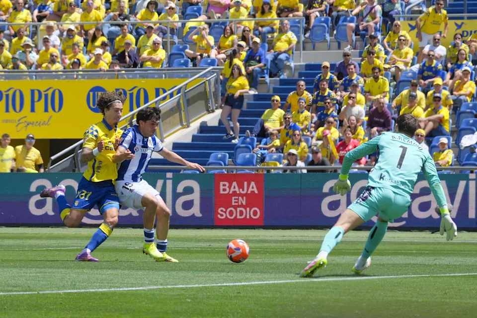 El conjunto de Imanol perdió por lesión a Zubeldia mediado el primer periodo y Las Palmas fue inclinando el campo hacia la meta visitante. En el tiempo de prolongación, Fábio Silva enganchó una gran volea con la pierna derecha y el balón se estrelló en el larguero en la mejor ocasión local.