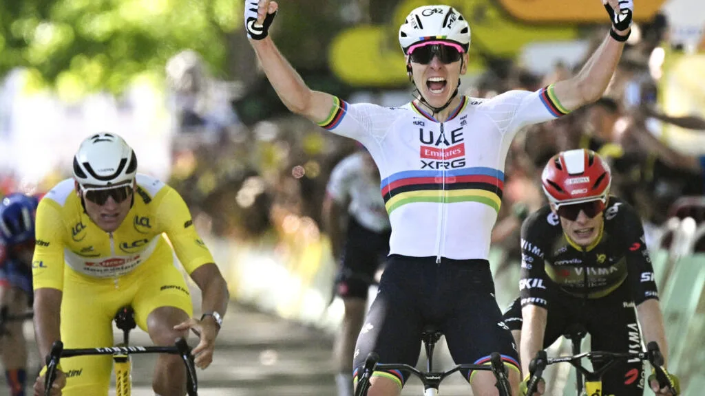 Tadej Pogacar superó en el embalaje al maillot amarillo Mathieu van der Poel y a Jonas Vingegaard para sumar un hito histórico a su carrera, su victoria numero 100 como ciclista profesional. Su equipo, el UAE Team Emirates, fue clave para la victoria.