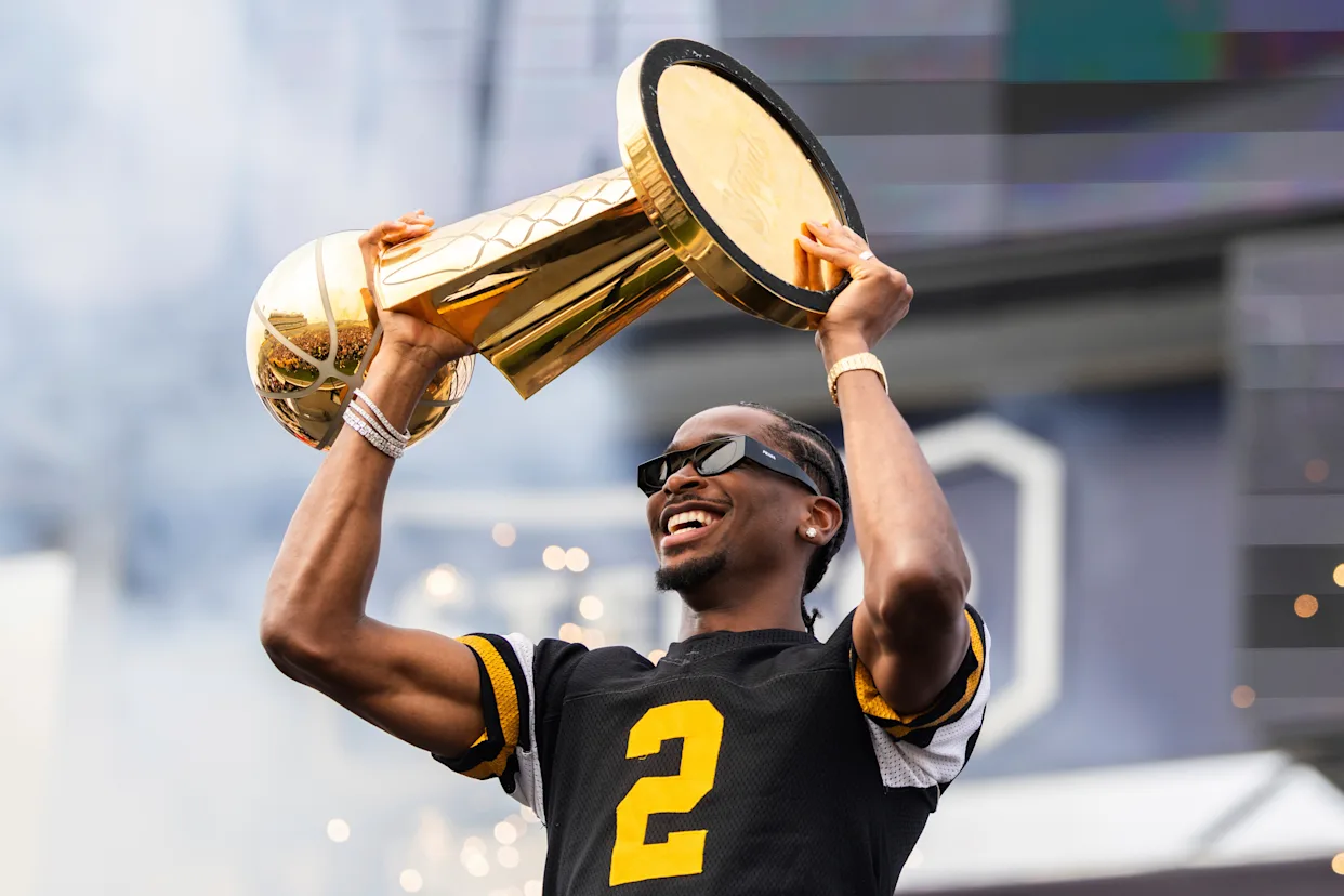 Shai Gilgeous-Alexander, del Thunder de Oklahoma City, sostiene el trofeo de campeón de la NBA, en su ciudad natal Hamilton, Canadá, el 7 de agosto de 2025 (Nick Iwanyshyn/The Canadian Press vía AP)