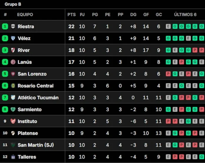 Zona B (River y Vélez empatados; Talleres 3° con 19 pts, clave para clásico)