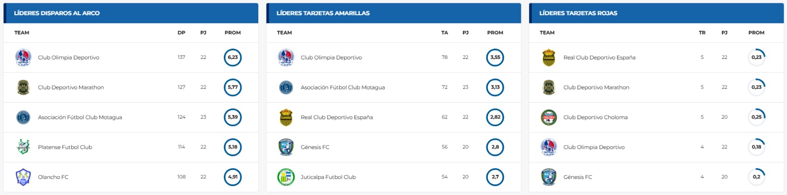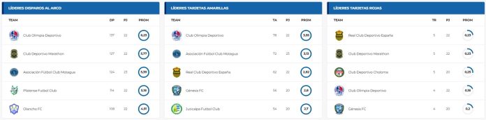 Motagua suma 72 amarillas en 23 juegos (3.13), mientras Real España registra 62 en 22 (2.82), lo que marca a los tres como equipos intensos, agresivos en la marca y con tendencia a cortar el juego rival con faltas tácticas.